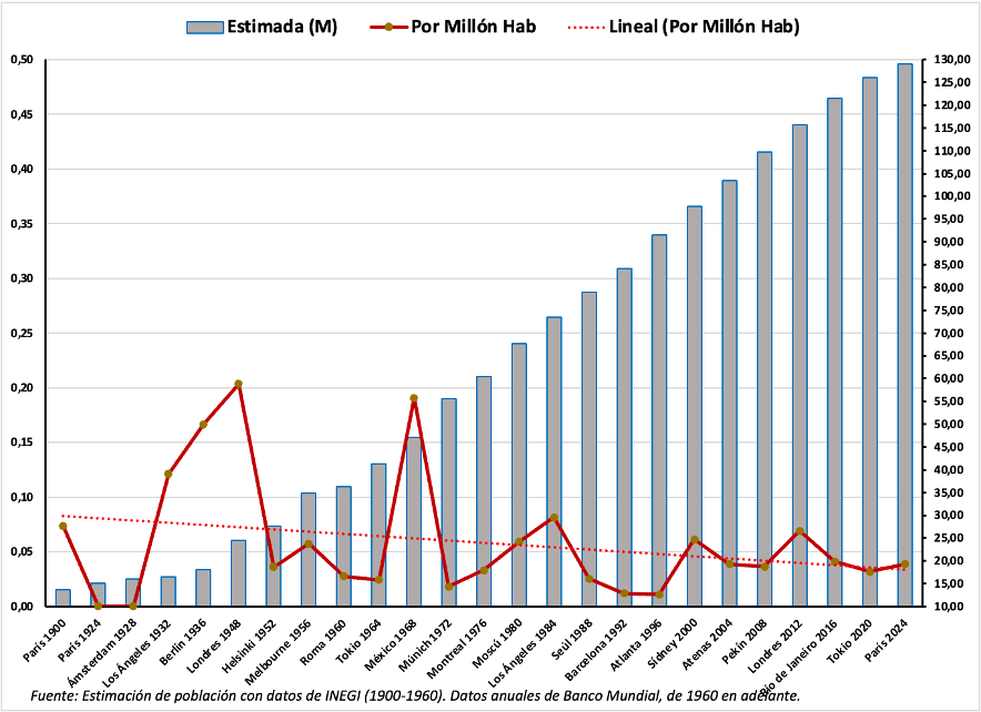 En lo que no se observa avance, sino una tendencia bajista, es en el número de medallas que se obtienen por cada millón de habitantes: mientras la población crece en forma exponencial, los logros siguen al mismo nivel, cuando no decrecen.
