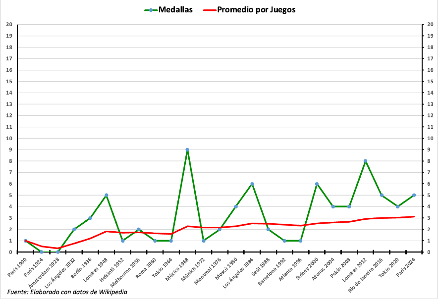 El promedio de preseas que México ha obtenido en cada una de las 25 ediciones de los juegos olímpicos en que ha participado subió de 3,04 a 3,12. Puede observarse que la media (vea la línea roja de la gráfica siguiente) viene en lento y apenas perceptible ascenso desde 1968, con una leve mejoría desde Atlanta 1996 porque, claro, en esa edición y en Barcelona 1992 la cosecha fue muy pobre, de una sola medalla.
