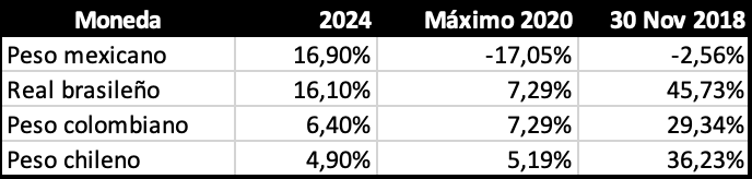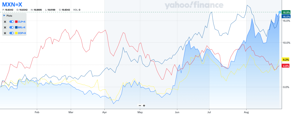 Véase la gráfica hecha en https://finance.yahoo.com que muestra la evolución del dólar contra las cuatro principales monedas de Latinoamérica: