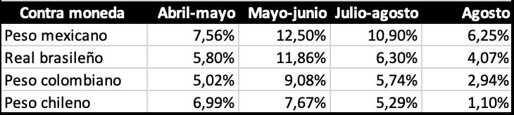El grado de afectación sobre las cuatro monedas comenzó a hacerse dispar en las últimas semanas de agosto, luego de la recaída de mediados de mes: retomó el deslizamiento hacia abajo contra los pesos colombiano y chileno, en tanto que produjo un tercer rebote frente al real y el peso mexicano. No obstante, en los días recientes se percibía que el colombiano y el chileno torcían de nuevo hacia arriba.