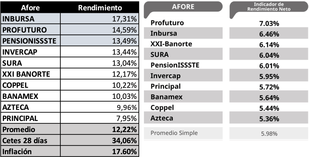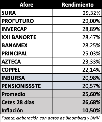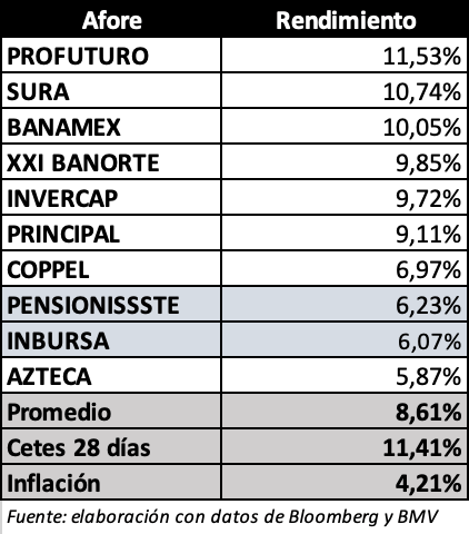 - Ya es notorio el rezago -una diferencia de más de 5% respecto de Profuturo- de PensionISSSTE e Inbursa, que suelen estar en el fondo