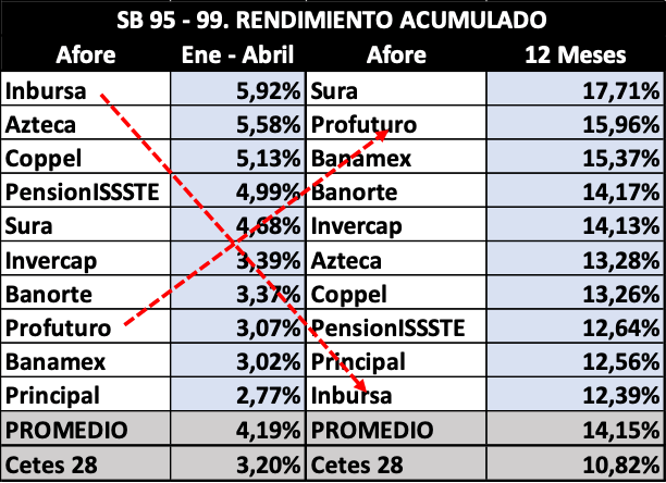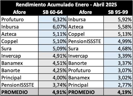 Las Siefores Básicas (SB) 95-99, las que pueden asumir más riesgo con el fin de producir rendimientos mayores, acumularon una ganancia directa de 4,19% (véase “PROMEDIO” en las tablas) en el cuatrimestre enero-abril, el periodo que comprende el estado de cuenta que llegará a partir de esta semana a los trabajadores. Es un porcentaje muy bueno y meritorio, considerando los reveses y la volatilidad extrema por la sacudida arancelaria. Y superior, ahora sí, y con claridad, al retorno acumulado (3,20%) de los Cetes de 28 días.