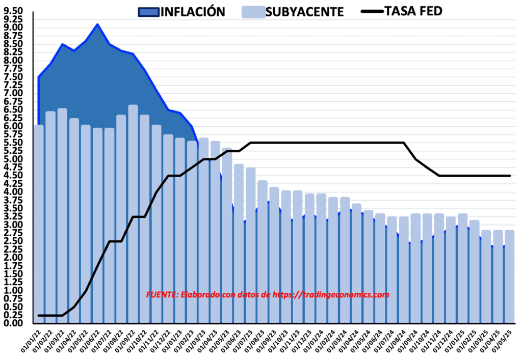 PORCENTAJES ANUALES DE INFLACIÓN, SUBYACENTE Y TASA DE FED. 2022 – 2025