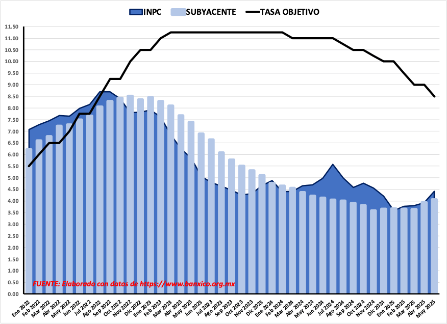 PORCENTAJES ANUALES DE INPC, SUBYACENTE Y TASA OBJETIVO. 2022 – 2025