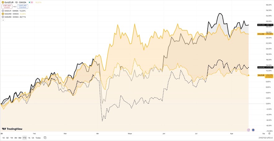 En la gráfica de oro y plata, hecha en TradingView, de enero a julio, en dólares (líneas sólidas), y euros (líneas punteadas), se aprecia que el oro ha sido rechazado cuatro veces luego de tocar o cruzar 3.400 dólares por onza, y que desde abril oscila en un ancho canal lateral. Y que la plata se debilitó al tocar 29 dólares, lo que podría inferirse como un acoplamiento retrasado con el metal dorado.