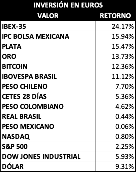 - El IBEX-35 de la Bolsa de Madrid produjo casi 37%, superando con creces el retorno de los dos metales preciosos y el Bitcoin.