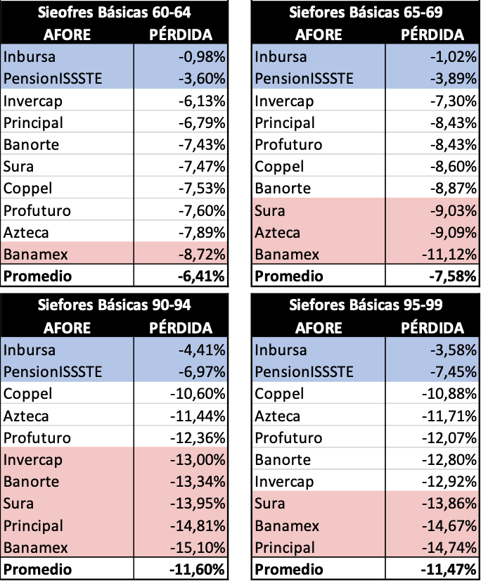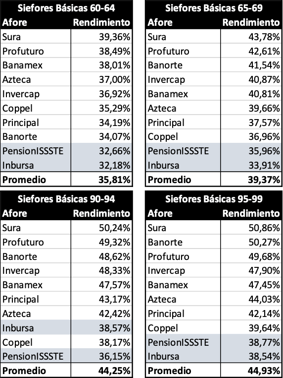 Inbursa y PensionISSSTE encabezaban las tablas tanto de los grupos de SB 60-64 y 65-69, que asumen menos riesgo e implican menor potencial de rendimiento, como de las 90-94 y 95-99, que pueden tomar más riesgo para intentar ganar más (las SB 95-99 aún no estaban activas, mas se puede calcular su desempeño). Eran notorias las diferencias que esas dos administradoras sacaban a las que ocupaban el tercer sitio, en cada uno de los casos. En el otro extremo, Banamex fue la de mayores pérdidas en tres de los cuatro grupos, mientras que Principal fue última en uno y penúltima en otro. Véanse las zonas sombreadas: Sura fue antepenúltima en tres de esos cuatro grupos, apenas arriba de las dos que perdieron más.