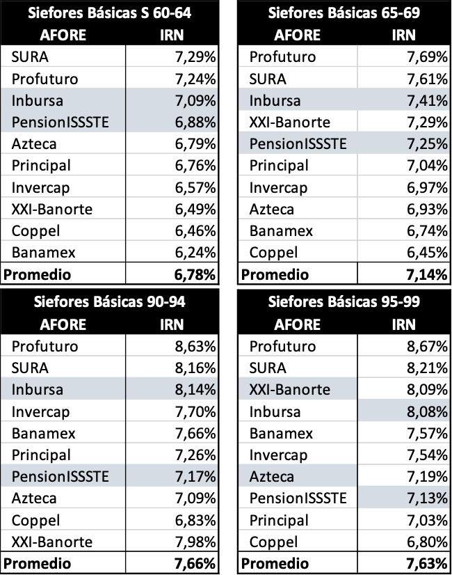 A octubre de 2025, el IRN presenta a esa administradora entre las cuatro primeras en tres de los cuatro grupos, a escasas décimas de la líder en todos los casos, lo que no justificaría dejarla para cambiarse a alguna de las primeras. A PensionISSSTE la posiciona como tercera en las SB 60-64, cuarta en las 65-69, y antepenúltima en los dos grupos de SB de trabajadores más jóvenes.