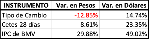 Aun con la volatilidad cambiaria que llevó el dólar a más de $21,00, en febrero, la preferencia por instrumentos en pesos se mantuvo. Los que aguantaron la depreciación y “apostaron” por el peso en esa racha difícil, fueron recompensados. Incluso a mediados de año, cuando la tasa de Cetes había descendido a 8%, el tipo de cambio de $19,15 perfilaba potencial bajista y motivaba la llegada de flujos adicionales. En efecto: más de la mitad del retorno acumulado en el año por la combinación de tasa libre de riesgo y apreciación cambiaria, se daría en el segundo semestre. El 23,35% de ganancia por la revaluación de peso más la inversión en Cetes dejó atrás, muy lejos, a lo que obtuvieron quienes siguieron con sus dólares en EUA, en mecanismos de corto plazo.