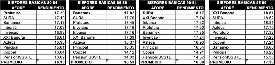 - Profuturo produjo en promedio el 17,19% en los cuatro grupos de trabajadores de más edad (de la 60-64 a la 75-79). Y superó con ello a todas las Afores de los grupos generacionales 65-69, 70-74, 75-79 y 80-84, e incluso, a cinco de las 85-89, a cuatro de las 90-94, y a tres de las 95-99.